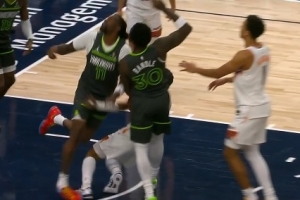 GIF-里德封盖落地时踩到古德温脚崴脚 暂时返回更衣室