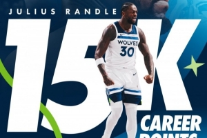 森林狼官方发推,祝贺兰德尔达成15000分里程碑。