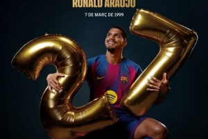 体育资讯3月7日讯 今日是巴萨后卫阿劳霍27岁生日,巴萨官方社媒晒照为其送上祝福。