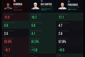 库明加场均12.0分5.9篮板2.5助攻,真实命中率52.0%、相对正负值-0.7、估计正负值-1.8,这6项数据中只有篮板比桑托斯和波津多;