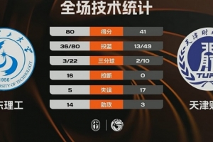 第四节,王虹延续火力,天津财大不断冲击内线苦苦支撑,王虹和邢欣相继三分穿针,马芮莹反击将分差拉开到40分以上,朱明慧内线得手,最终,山东理工80-41大胜天津财大。