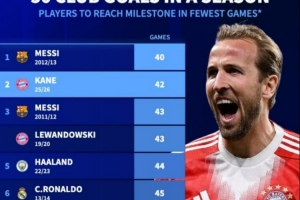 单赛季达成50球最快纪录榜:梅西40场居首,凯恩本赛季42场次席